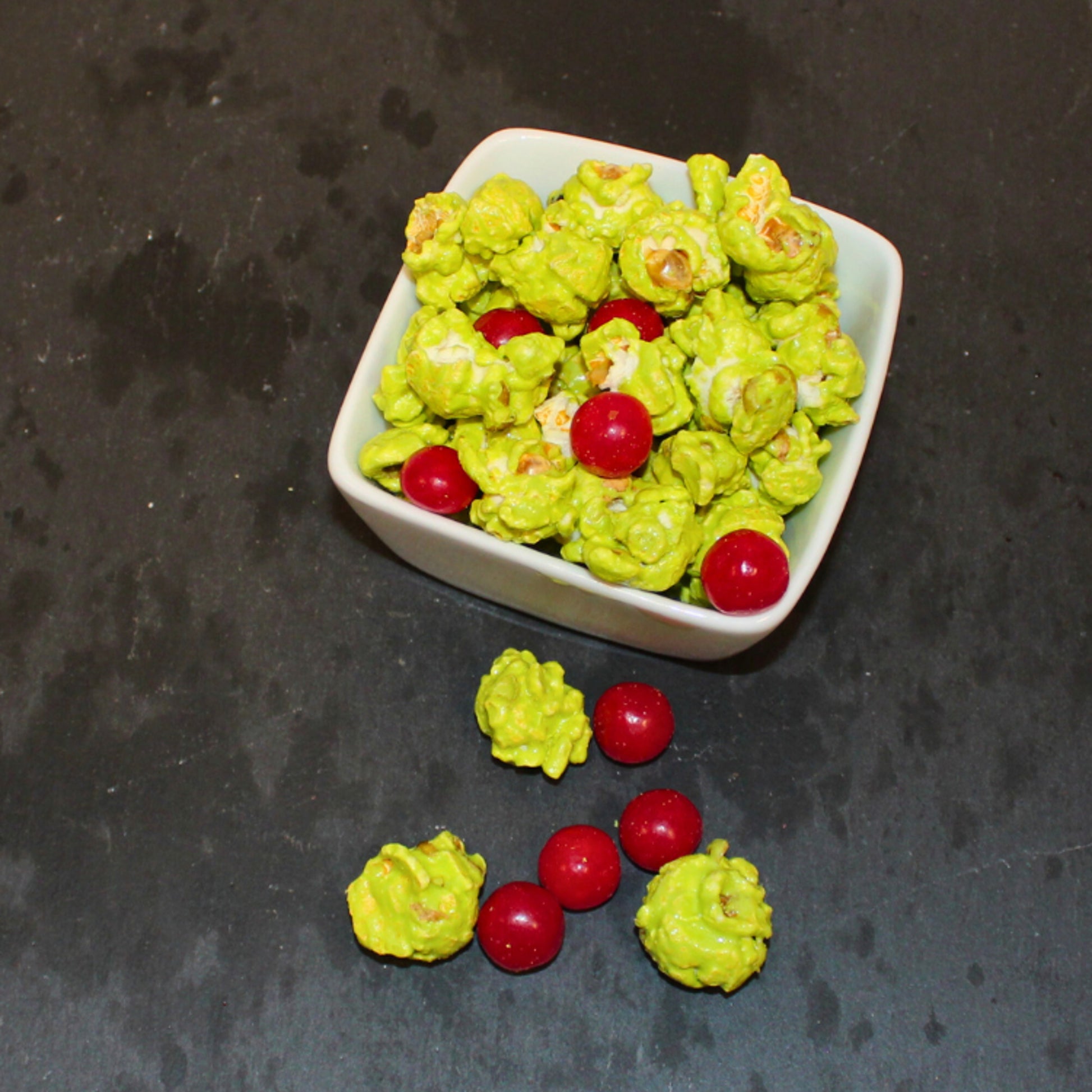 Spread holiday cheer with our 1 Dozen Cones - Grinchy Mix! This fun vanilla popcorn mix comes with 12 cones for easy gifting. Each cone is topped with cherry sour ball candy, making it a delicious and festive treat. Perfect for Grinches and non-Grinches alike!
