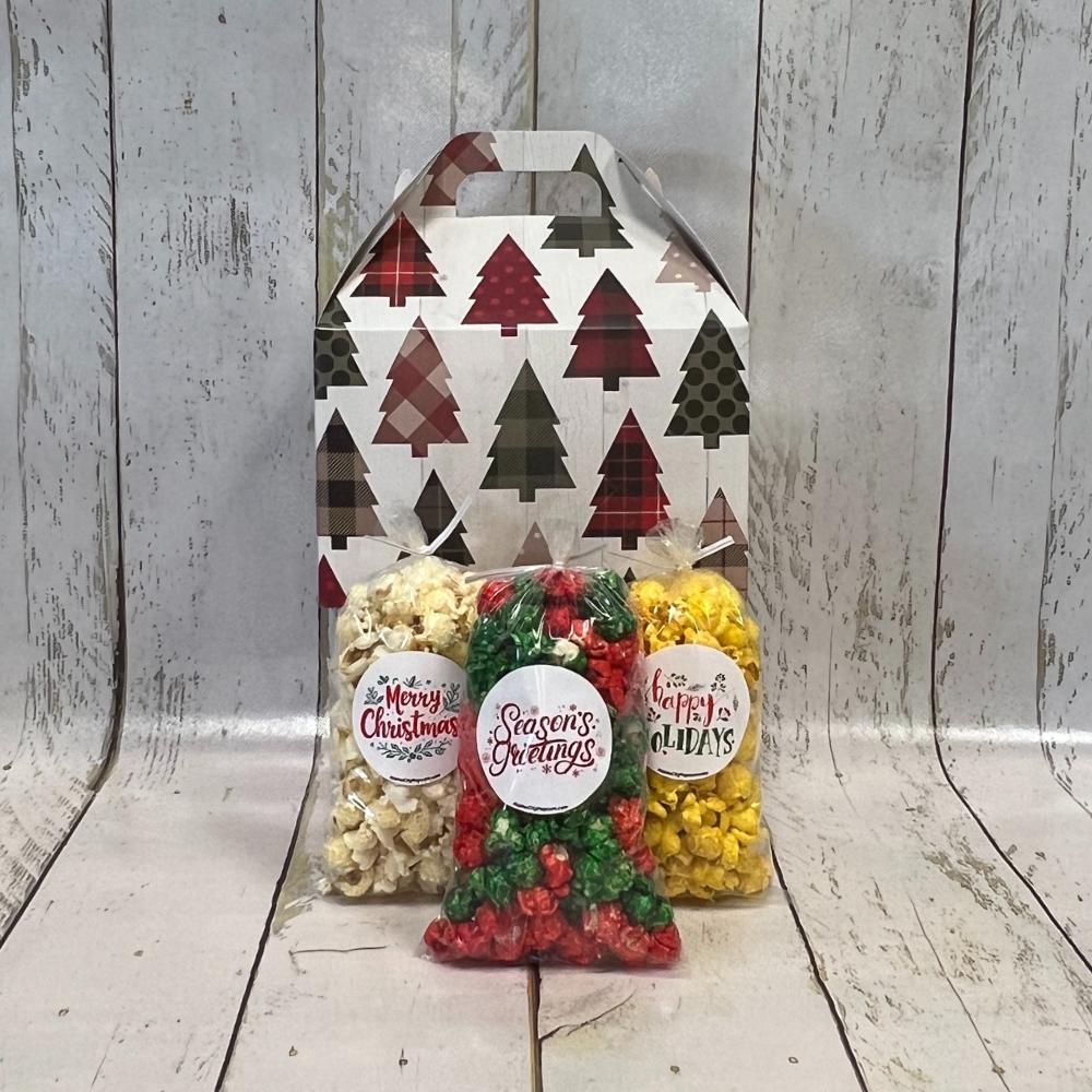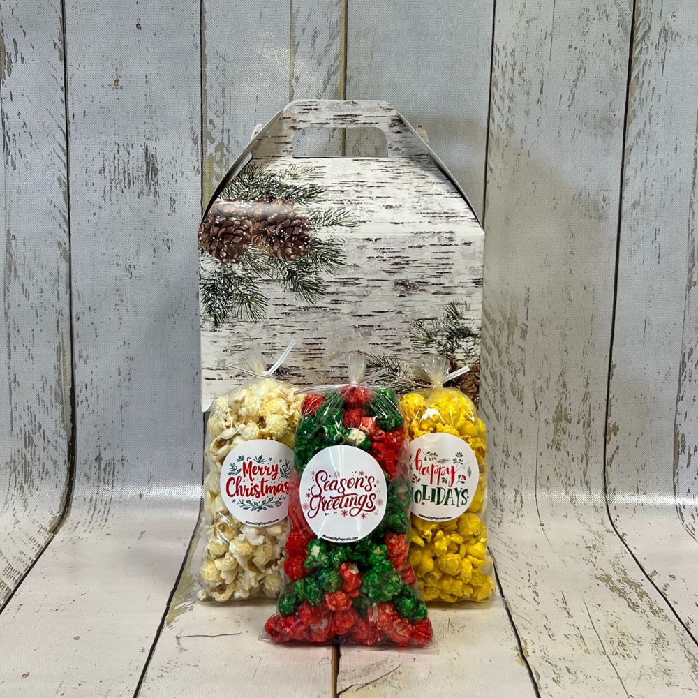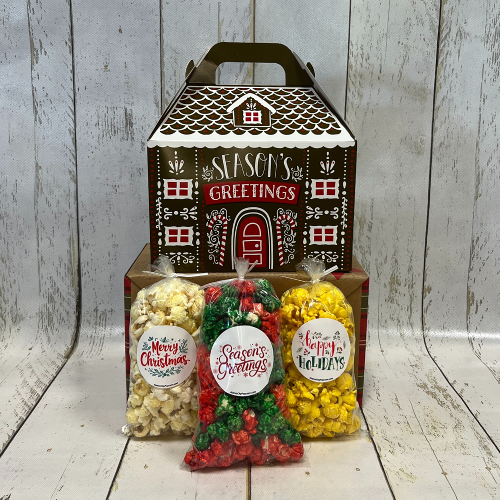Holiday Gable Box - Includes 3 mini bags of gourmet popcorn of your choice.