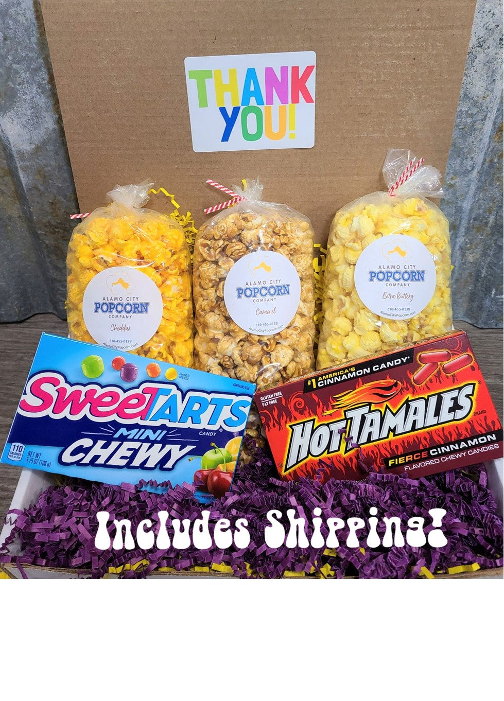 Thank You Pack - You select three popcorn flavors and we select two boxed candies! Price includes shipping to any front door in the continental U.S.